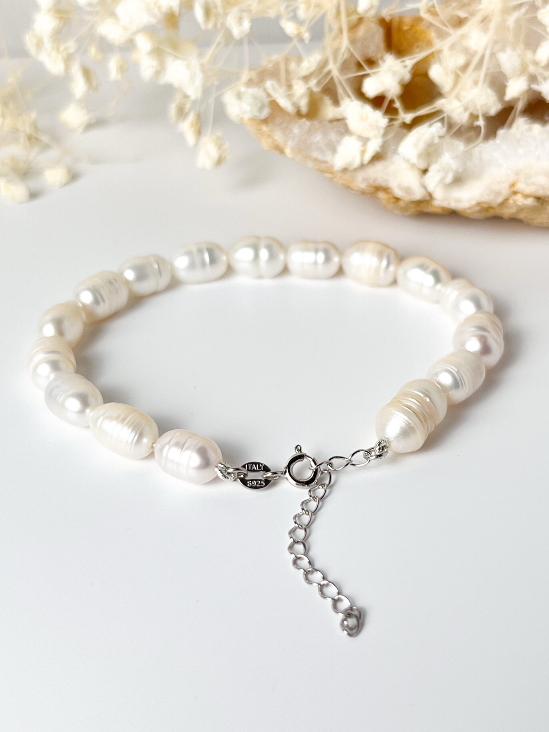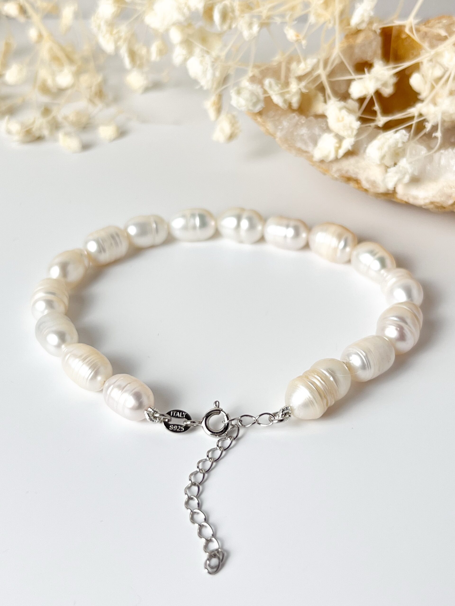 المواد:لؤلؤ المياه العذبة شبه الباروك – فضة إيطالية عيار 925 – مغلاق فضي قابل للتعديل– خيط حريري.