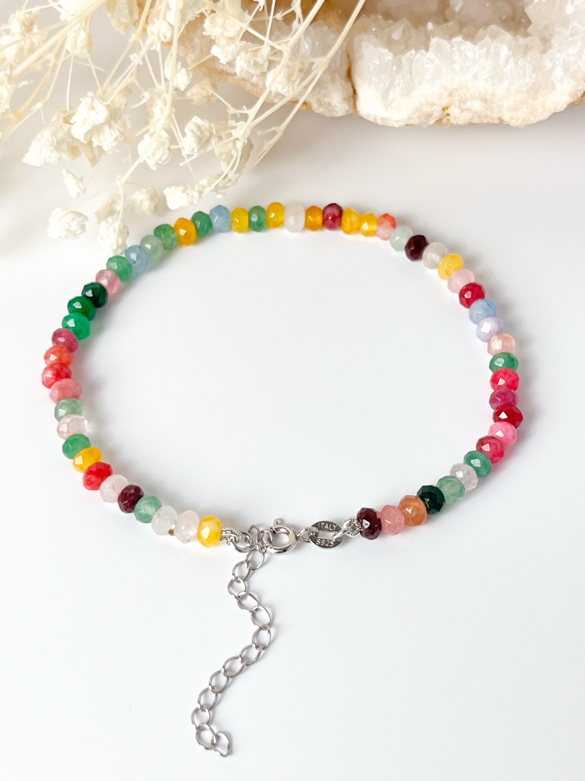 • المواد: جاسبر ياقوتي طبيعي متعدد الألوان– فضة 925 مطلية بالروديوم – خيط حريري فاخر.