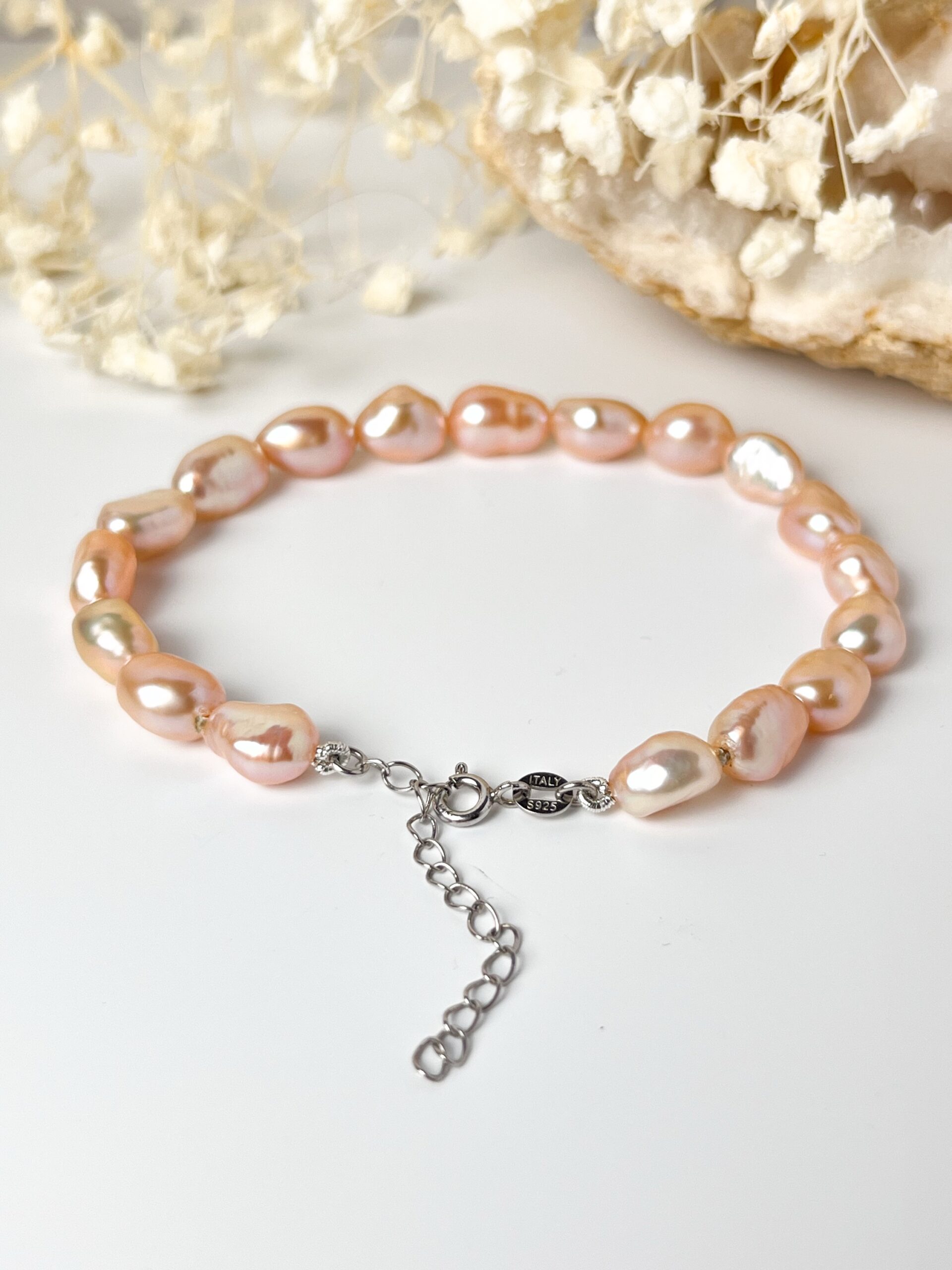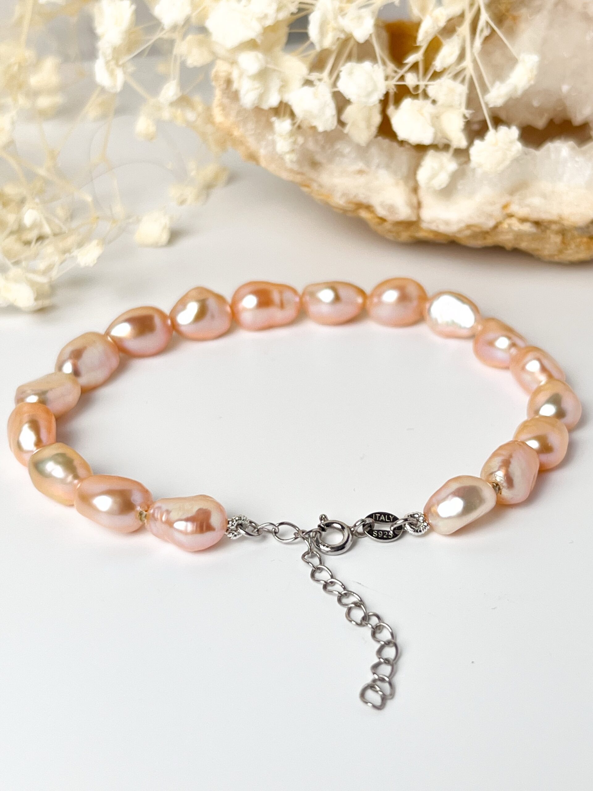 المواد:لؤلؤ المياه العذبة شبه الباروك السلموني – فضة 925 مطلية بالروديوم – مغلاق فضي قابل للتعديل – خيط حريري فاخر.