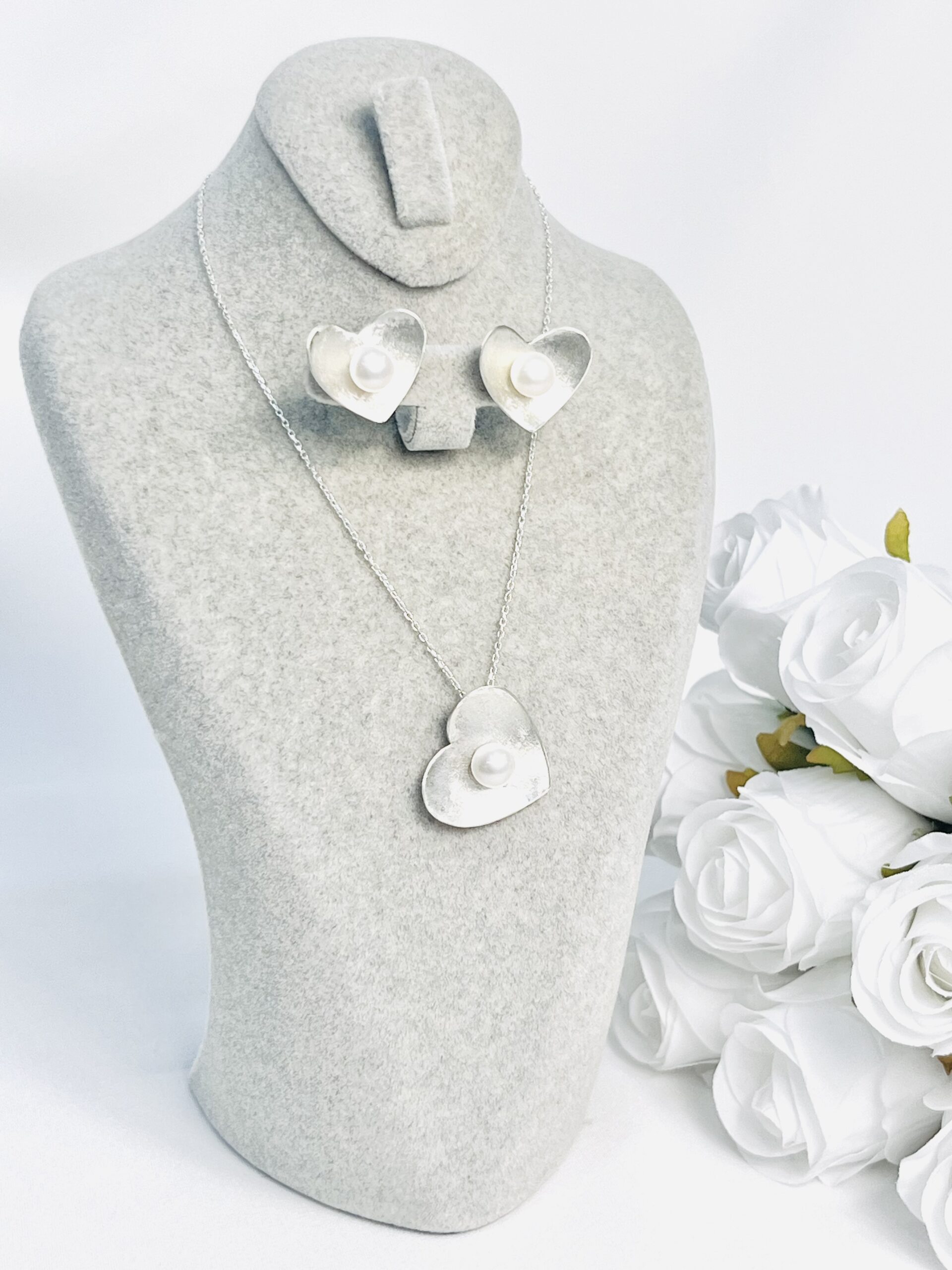صُنع الطقم يدويًا من فضة عيار 925 النقيّة ، تتوسّط كل قطعة منه لؤلؤة طبيعية 100%،ناعمة داخل قلبٍ من الفضة المصقولة بعناية،